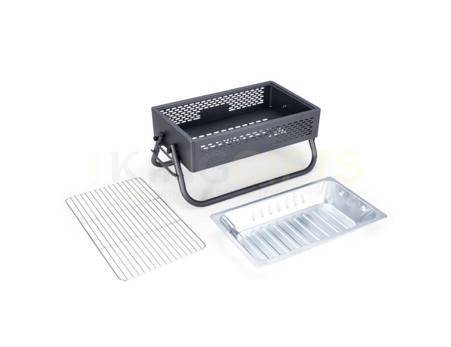 Churrasqueira em ferro com aberturas para ventilação e pés montáveis, que também podem ser utilizados como alças para transporte quando a churrasqueira não estiver em uso. Conta ainda com grelha em metal galvanizado e bandeja metálica com alças removíveis para acomodação do carvão.